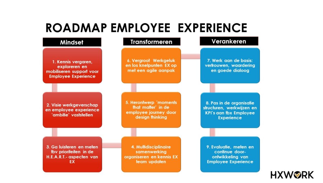 In het Nationaal Onderzoek Employee Experience 2022 van PW. en HXWork vroegen we welke vraag je hebt over employee experience. De meeste reacties gingen over de implementatie: hoe breng je employee experience (EX) in praktijk? Waar begin je? Hoe zetten we de goede stappen? Heleen Mes legt de ideale roadmap voor EX in drie fasen uit.