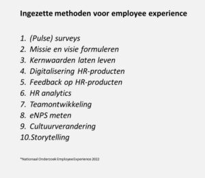 Bij het inzetten van methoden voor de employee experience staan (pulse) survey’s op de eerste plaats. “Organisaties zijn de laatste jaren vaker en dieper gaan meten, zegt Heleen. De volgende stap is een ‘continuous listening strategie’ uit te werken waarin naast kwalitatief onderzoek, ook kwalitatief onderzoek een plek krijgt.”