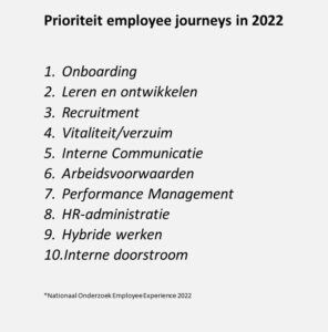 In de employee journey geeft het onderzoek aan dat onboarding  (71%) de hoogste prioriteit krijgt: een goed begin is het halve werk. Daarna volgt ‘leren en ontwikkelen’ (64%) en ‘recruitment’ (61%). Heleen: Volgens onderzoek geven investeringen op het gebied van wellbeing, training en ontwikkeling de beste return on investment (PWC 2022). Daarnaast blijkt dat ‘goede gesprekken’, 1-op-1 voeren over werk belangrijk bijdraagt aan wellbeing en employee experience. Volgens internationaal onderzoek hebben de ervaringen rond ‘life events’ – denk aan geboorte van kinderen, ziekte van familie – een 3 keer zo grote impact op de employee experience dan het gemiddelde van de employee journey (Ti People, 2022). Dat zou ervoor pleiten om dit meer prioriteit te geven. Veel organisaties bepalen hun prioriteiten op basis van de eigen HR-expertise in plaats van de ervaren dieptepunten door medewerkers en de impact daarvan.”