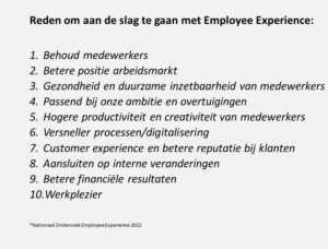 Behoud van medewerkers staat op de eerste plaats als reden om aan de slag te gaan met employee experience. “Een goede zaak, want iedereen die je niet kwijtraakt hoeft ook niet vervangen te worden. In eerdere jaren was het versnellen van processen en lagere kosten nogal eens prioriteit: functioneel, sneller, digitaler. Maar dat is minder geworden. We hechten nu meer waarde aan goed werkgeverschap.”